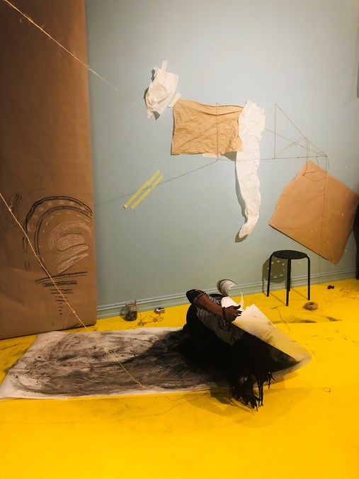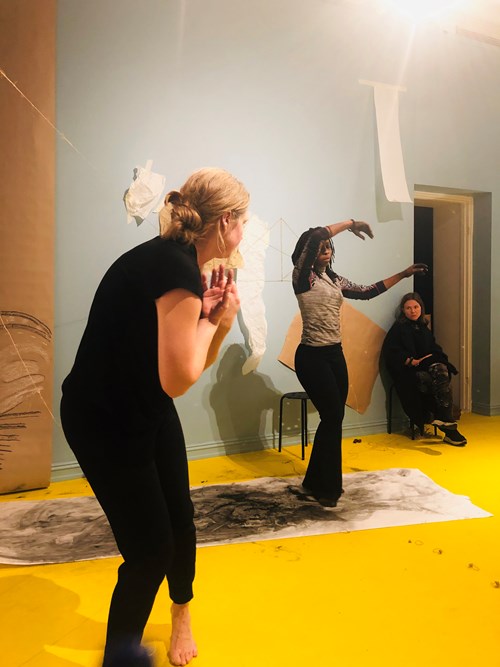 Rommet er fylt av en mengde forskjellige ting, her er papirlapper og malesaker, gamle krukker og garn, stoffrester, treverk, små og store steiner, en discokule og en baseball – et mangetydig vev av tanker, bilder og minner. En av deltakerne smører kull utover et et stort, hvitt ark med hendene. Hun legger seg over arket og klærne blir dekket av svart kull. En annen skrur på en vifte, stiller seg inntil veggen og lar det grå papiret på veggen slå mot henne. Etterhvert øker intensiteten hos samtlige. Tekst, dans, musikk, bilder og video utvikler seg til en bevegelig installasjon – og flere av dem flytter seg rundt i rommet. Noen av dem møtes i en felles dans, andre beveger seg så vidt ute av sin egen sone før de trekker seg tilbake.