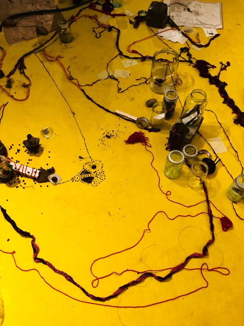 Det er torsdag ettermiddag på Interkulturelt museum. Talent Norges satsing TekstLab har invitert publikum til en work-in progress forestilling som en del av deres Glokale Stemmer-festival, som arrangeres for syvende gang i år. Publikum trer inn i galleriet der gulvet er belagt med et mykt, gult teppe. Veggene er dusblå, bortsett fra den ene veggen som er fylt av grått papir. På gulvet sitter syv kunstnere i hver sin sone av arbeidsrommet. Noen maler, andre hekler, en av dem bygger et lekeslott ved hjelp av fyrstikker, trepinner og hyssing. Alle arbeider konsentrert og nynner på en melodi som driver sakte gjennom rommet.