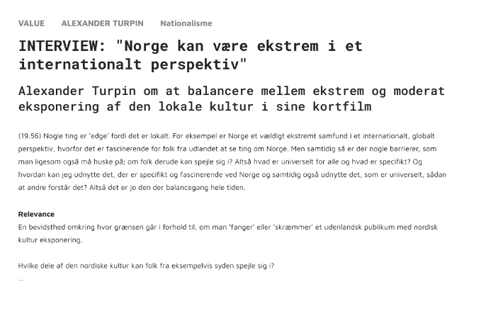I et intervju problematiserer for eksempel Globus-talent Alexander Turpin at han utelukkende møter andre regissører fremfor komponister, forfattere og andre relevante samarbeidspartnerepå filmfestivaler, og spør hvordan vi kan bryte opp denne siloen.