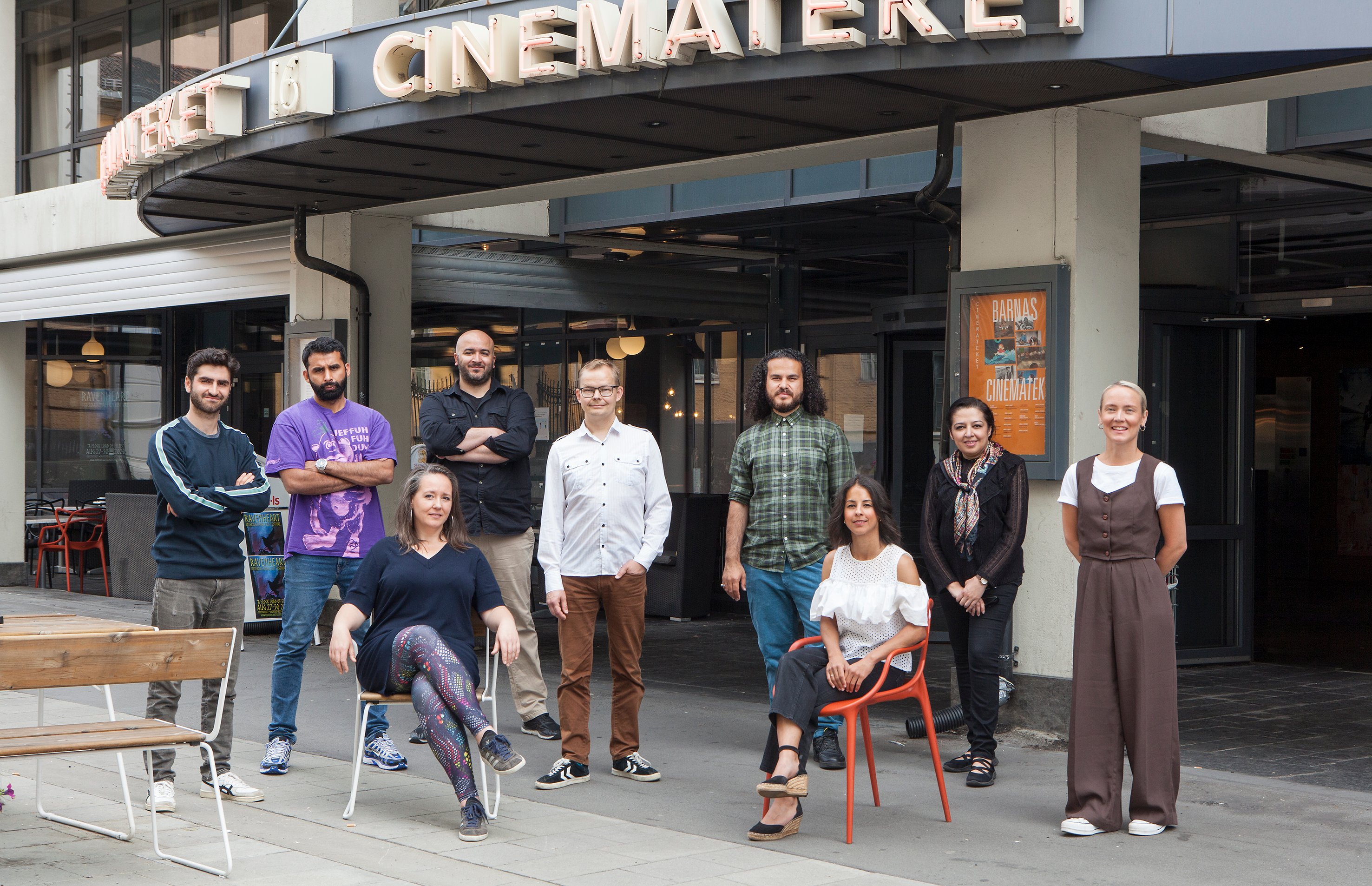 Deltakerne i UP 2.0: Fra venstre: Brwa Vahabpour, Adel Khan Farooq, Khalid Maimouni, Egil Pedersen, Mohamed Jabaly, Mahmona Khan, Elle Márjá Eira. Foran: Natasa Urban og Renée Hansen Mlodyszewski. Elisa Fernanda Pirir, Kaveh Tehrani og Sara Margrethe Oskal var ikke til stede da bildet ble tatt. Foto: Caroline Roka