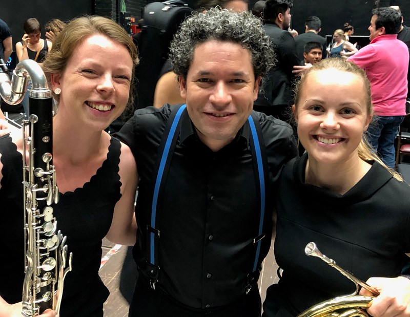 På bildet: KonstKnekt-talentene Ingeborg og Tone, med Gustavo Dudamel