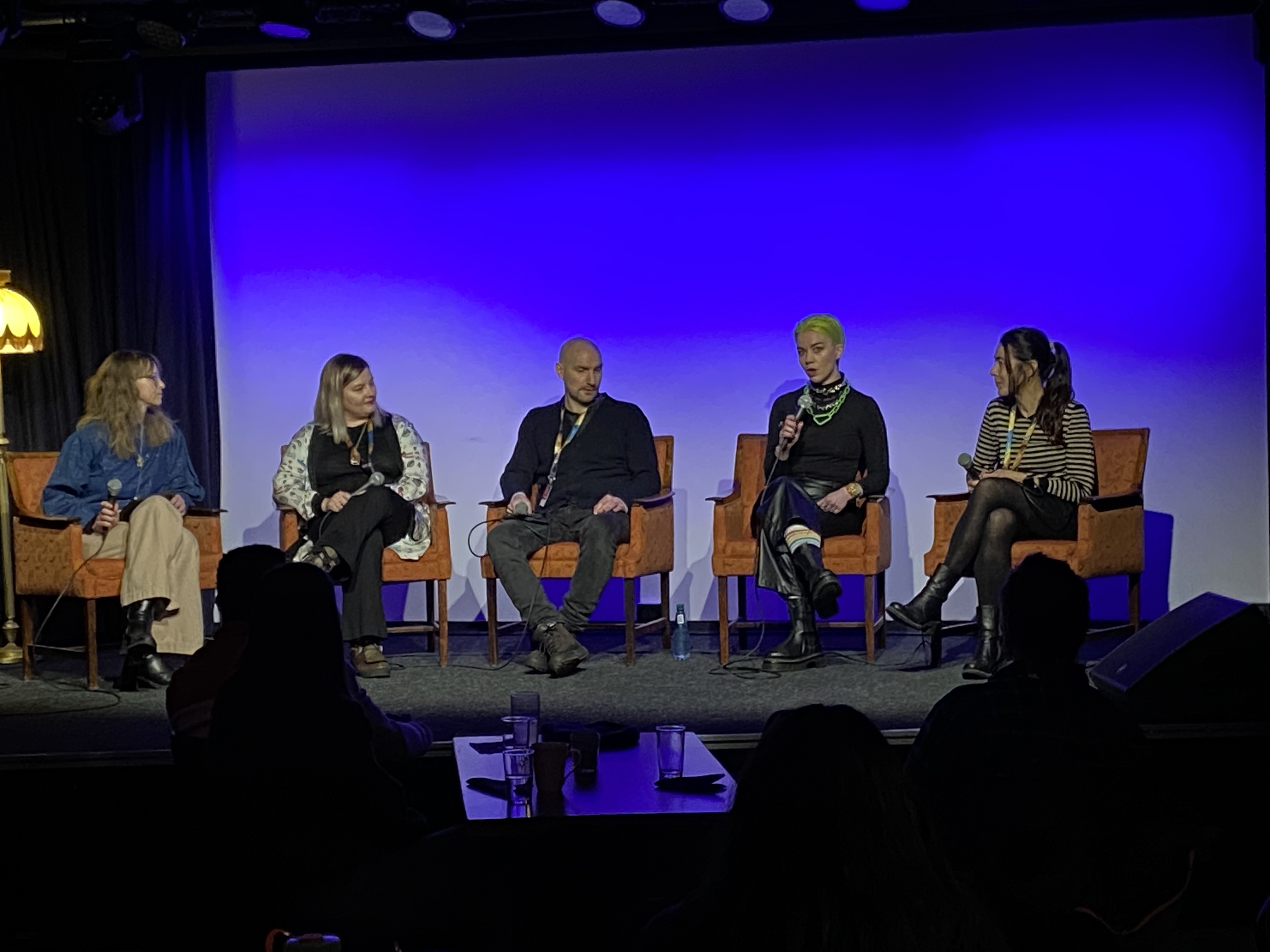 På bildet er fra venstre Silje Riise Næss, direktør i Talent Norge og tre av de deltakende filmskaperne 2024-26, Åse Kathrin Vuolab, Robin Jensen, Hedda Virik sammen med Mer Film-produsent Maria Ekerhovd. Emilie Blichfeldt var opptatt med pre-produksjon på sin første spillefilm og kunne i delta på årets utgave av Tromsø filmfestival. (Foto: Mer Film)