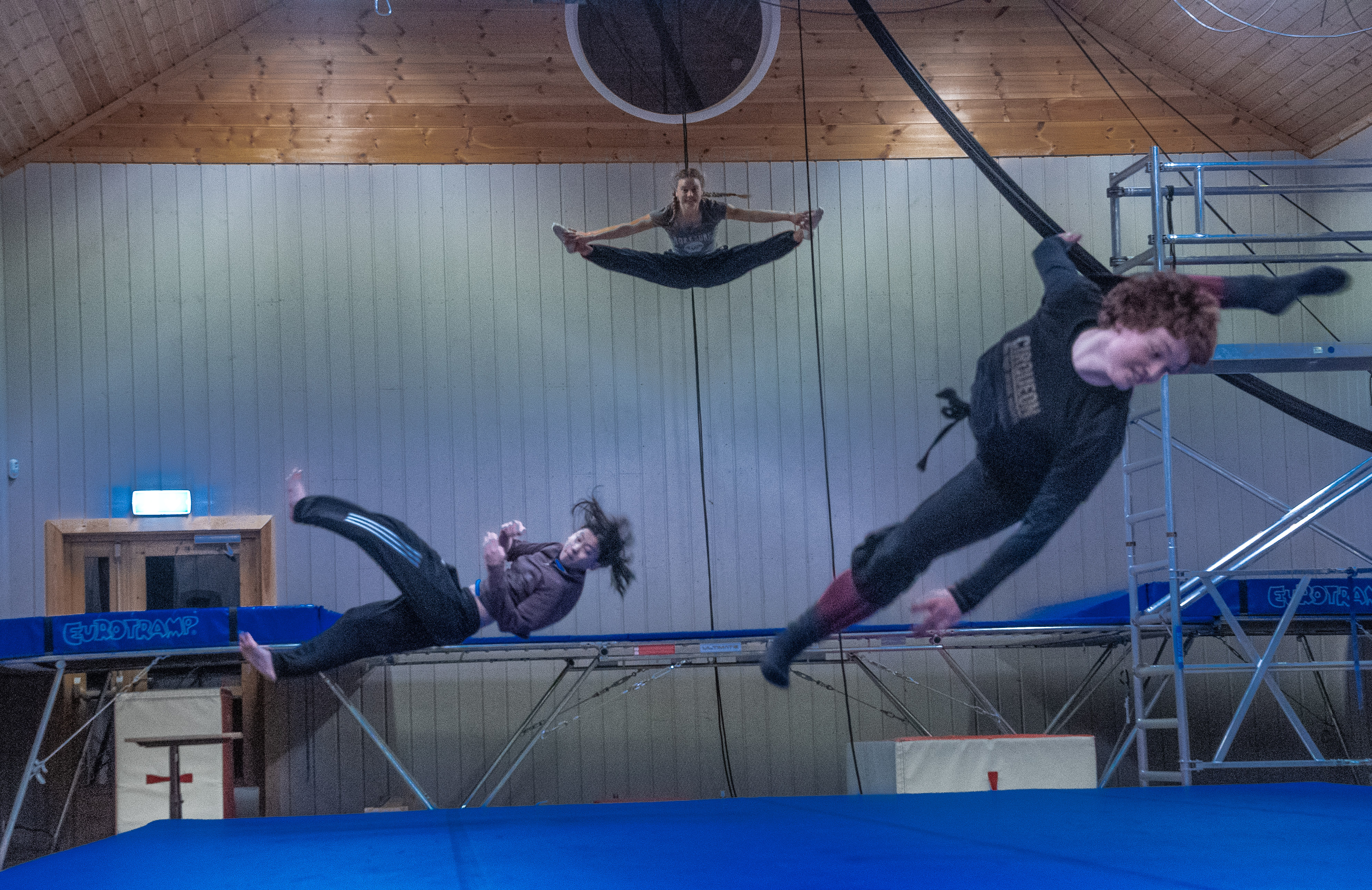 Trening i Smia. Anna Opsahl til venstre, Zelda Lyseng Storvik til høyre og Abigael Winsvold oppe i midten.